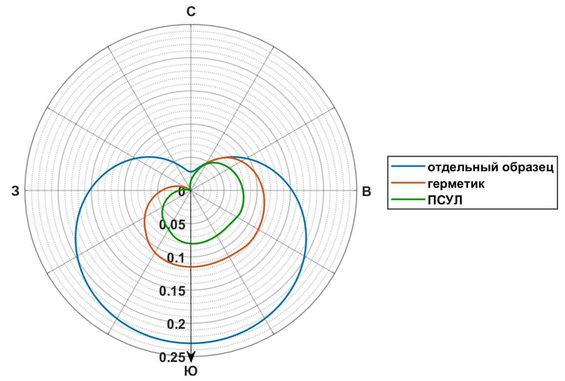 Для сопоставления был выполнен расчет для трех конкретных случаев: отдельно расположенного открытого образца, герметика между оконной рамой и выступом стены и ПСУЛ, установленного в том же узле с учетом геометрии проема (см. рис.1). В этой схеме на открытый образец попадают лучи в широком диапазоне азимутов, на герметик – уже только часть этого диапазона, а для ПСУЛ часть лучей дополнительно перекрывается выступом стены, так что доступный диапазон становится еще уже. Расчет выполнялся для широты Москвы при всевозможных ориентациях окна по азимуту (сторонам света), его результаты (осредненная относительная интенсивность) нанесены на круговую диаграмму (см. рис. 2).